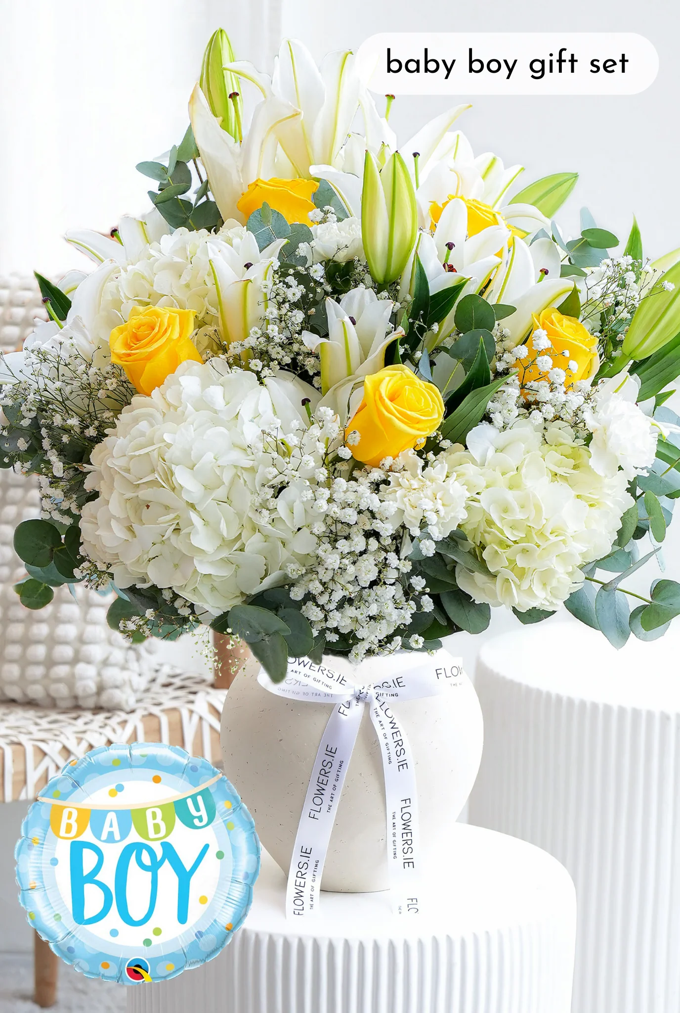 Welcome the new baby and congratulate the new parents with our Wonderfully Yellow bouquet from our luxury range, featuring a beautiful combination of yellow roses, white carnations, white hydrangeas, white lilies, and gypsophila arranged in a stylish ceramic vase. The perfect way to celebrate and bring warmth to the new arrival.