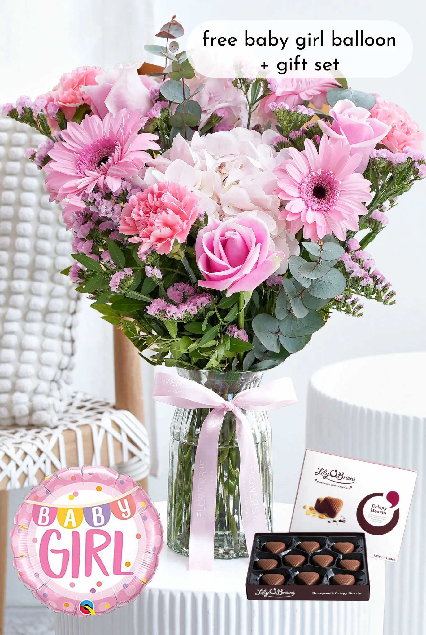 Congratulate the new parents with our "Pretty Pink" arrangement, featuring delicate pink hydrangeas, pink gerberas, soft pink carnations, and large-headed roses, with pink statice adding texture and depth. This charming and romantic bouquet is the perfect way to celebrate their new bundle of joy and bring a sense of peace and tranquility to their home.