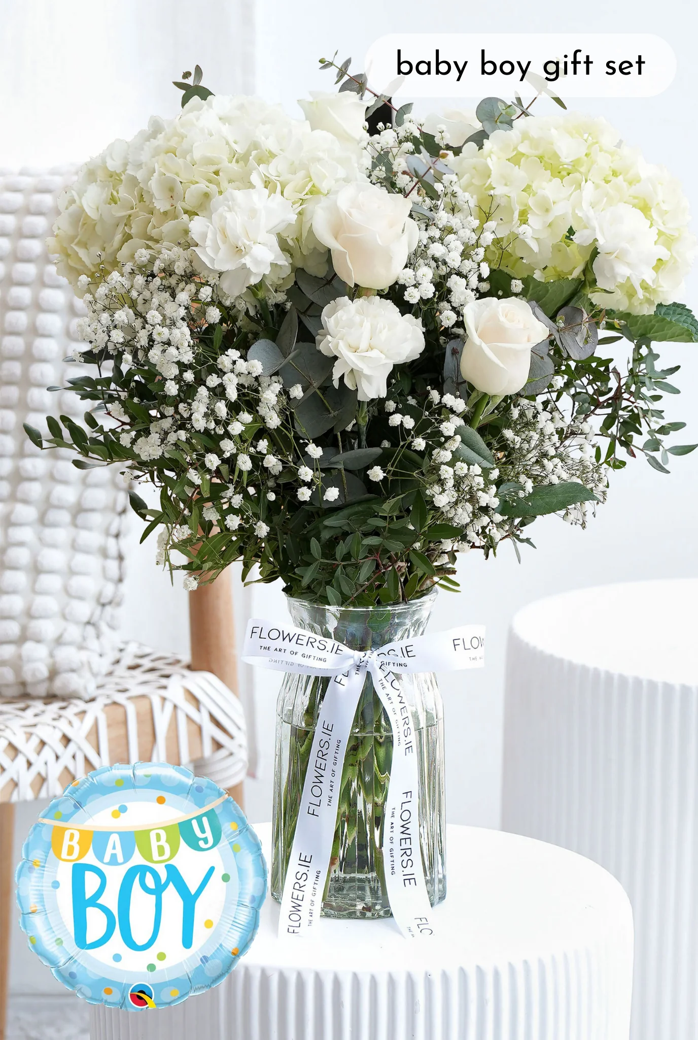 Welcome the new baby with our "Perfect White" arrangement, featuring pristine white hydrangeas, classic white roses, delicate gypsophila, and fresh pistacia leaves. This elegant and timeless bouquet is the perfect way to celebrate and bring warmth to the new arrival.
