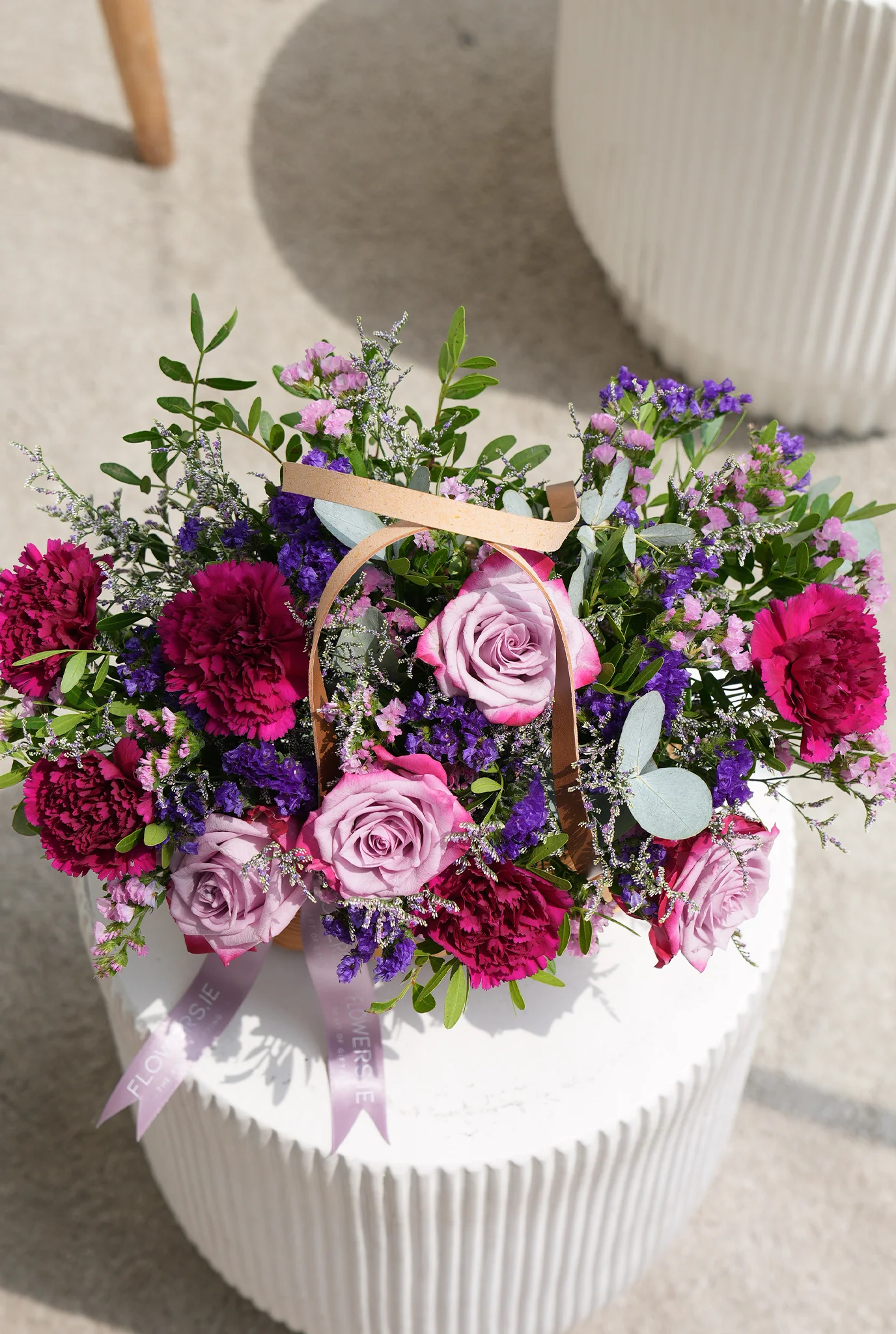 Celebrate a new home with our elegant Lavender Floral Basket — a graceful blend of purple roses, statice, carnations, and thistles with fresh greenery, bringing sophistication and charm to any space.