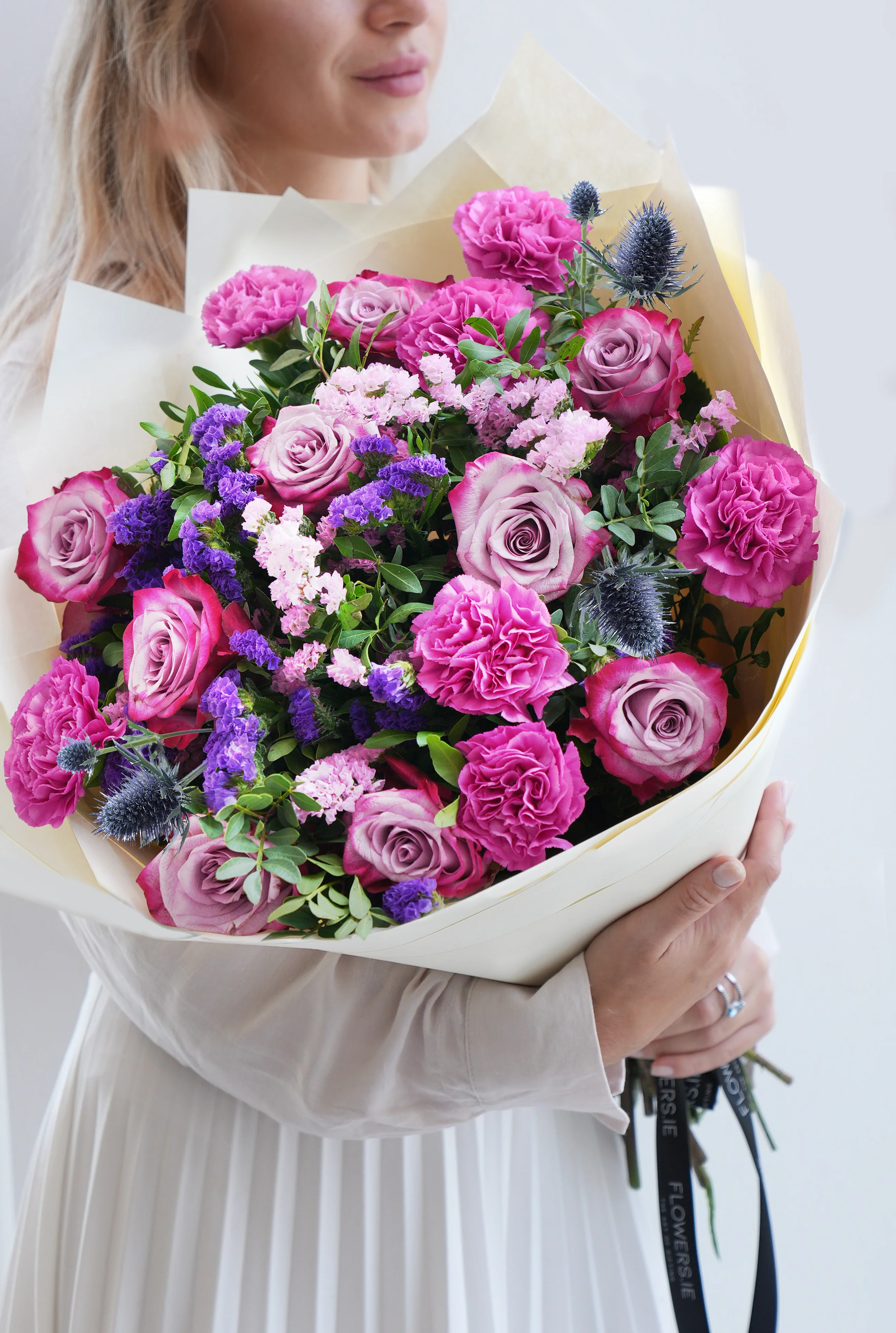 Experience the regal and majestic beauty of our Lavender Floral hand-tied flower bouquet arrangement, featuring luxurious deep purple roses, delicate blue statice, textured purple carnations, and thistles with pistacia leaves adding a touch of greenery. Perfect for any occasion, this arrangement exudes sophistication and elegance.