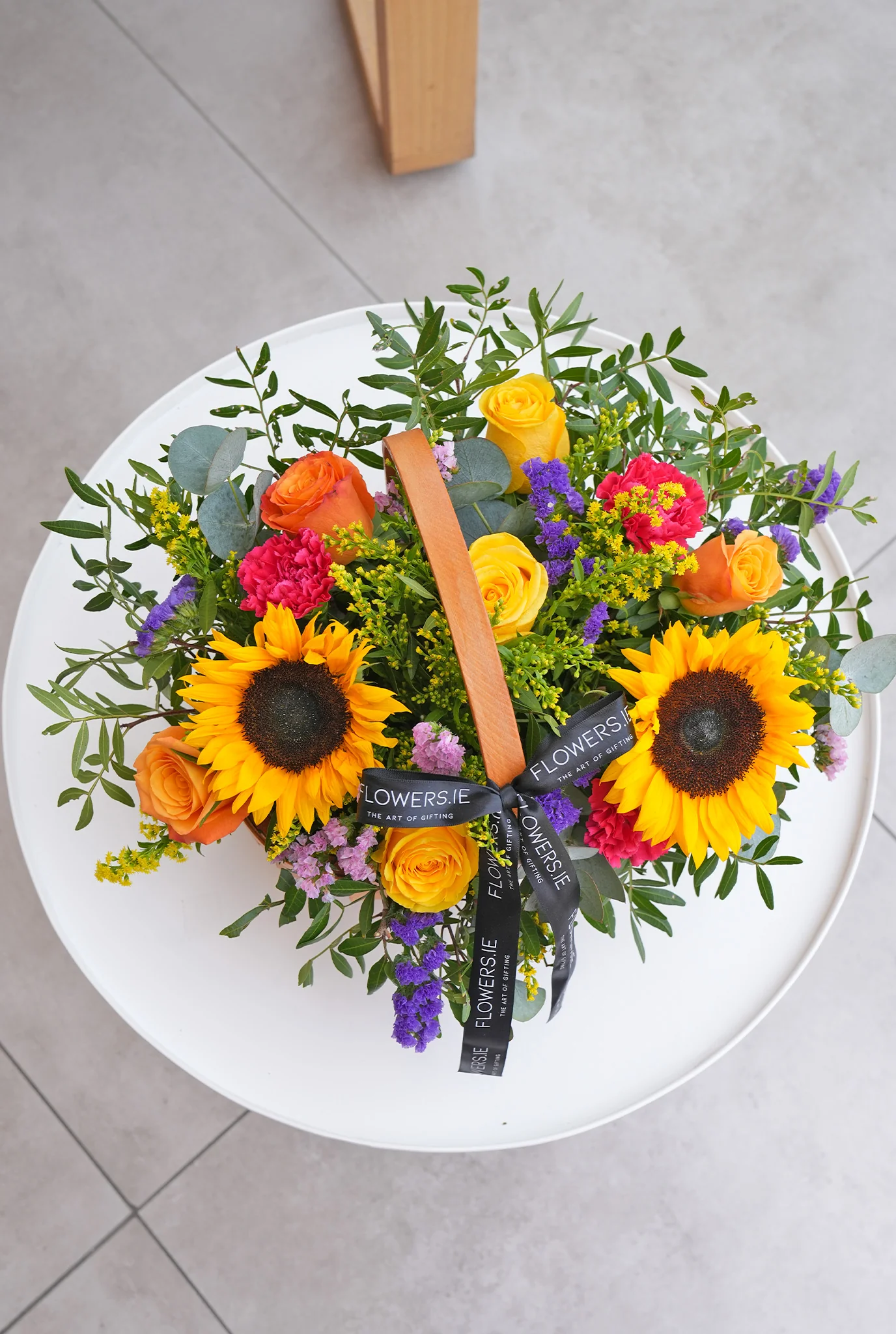 Brighten up any room with our "Vibrant Basket" arrangement, featuring stunning sunflowers, blue and pink statice, and vibrant yellow and orange roses. This cheerful arrangement is sure to bring joy and happiness to any occasion. Â