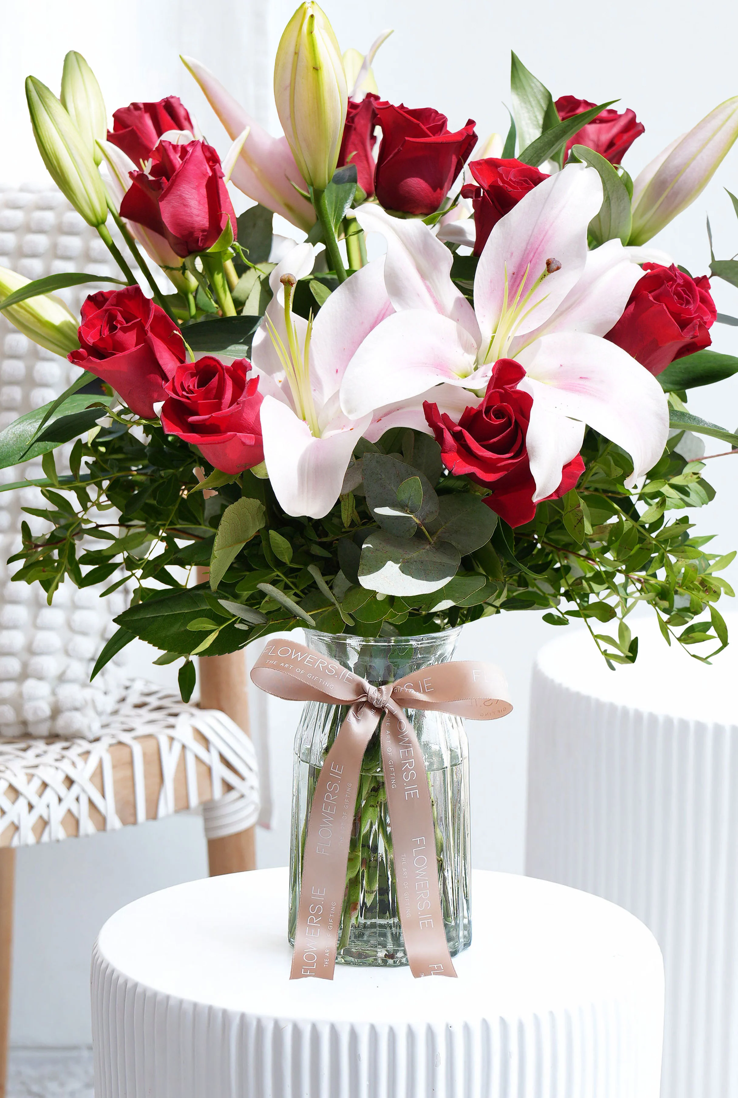 Elevate any occasion with our stunning Red Roses and Pink Lily in a vase with eucalyptus leaves! Expertly arranged by our skilled florists, this striking combination of bold red roses and delicate pink lilies, perfectly complemented by the fresh greenery of the eucalyptus leaves, is the perfect way to add a touch of luxury and elegance to any space.