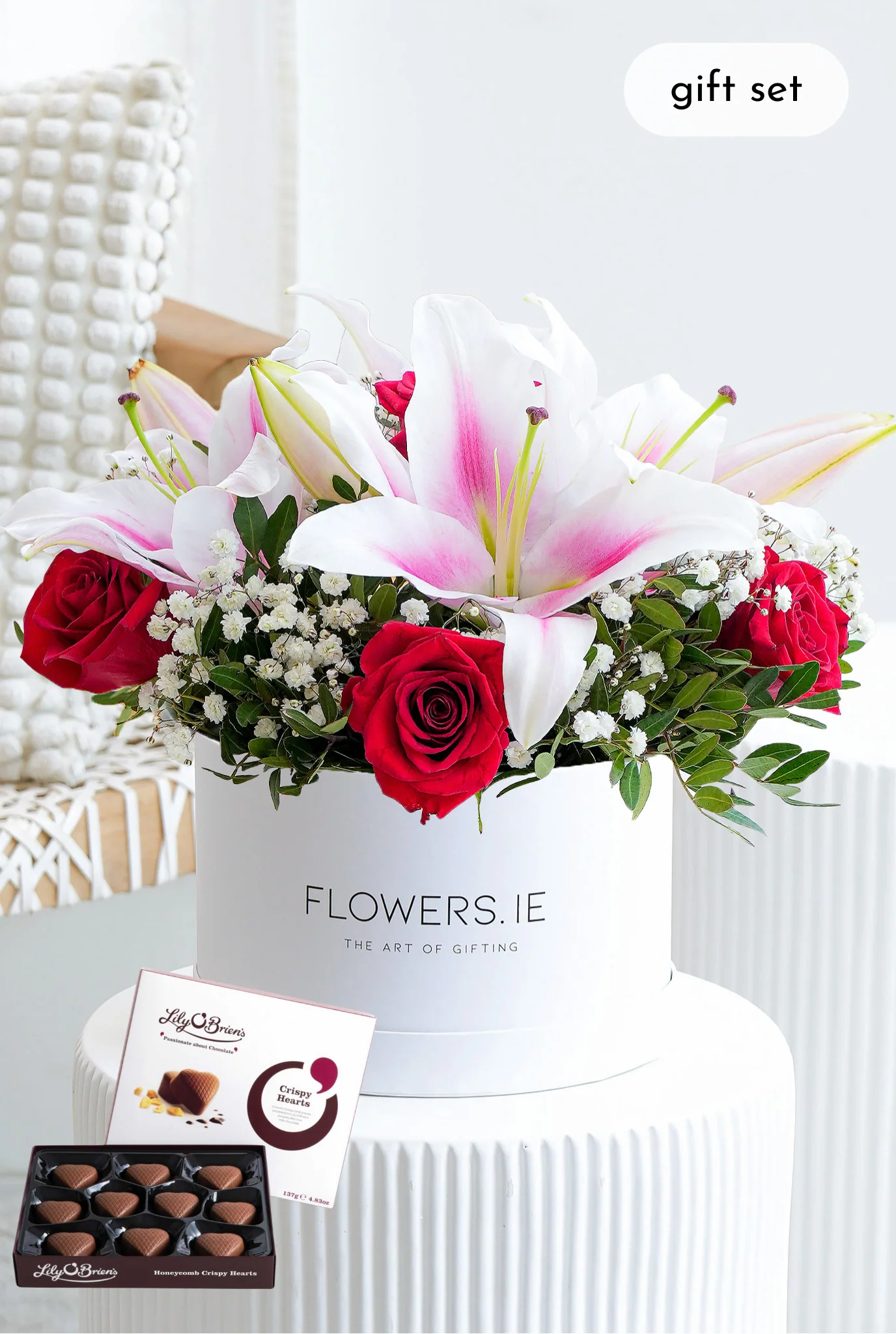 The delicate pink roses and lilies, perfectly complemented by the fresh greenery of the eucalyptus and pistacia leaves, are presented in an elegant hatbox for the ultimate in luxury and sophistication.