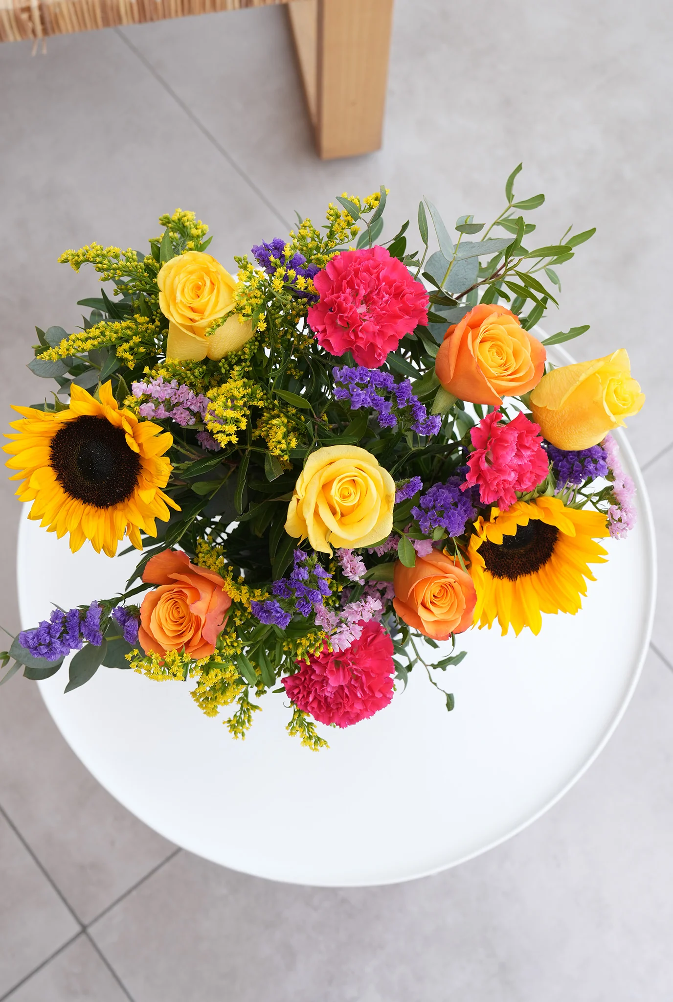 The Vibrant vase arrangement exudes a lively and uplifting energy with its vibrant sunflowers, blue statice, pink statice, yellow roses, and orange roses. Accented by the refreshing presence of pistacia leaves and eucalyptus leaves, this arrangement serves as a heartfelt tribute, offering a burst of colour and warmth during moments of sympathy and remembrance.