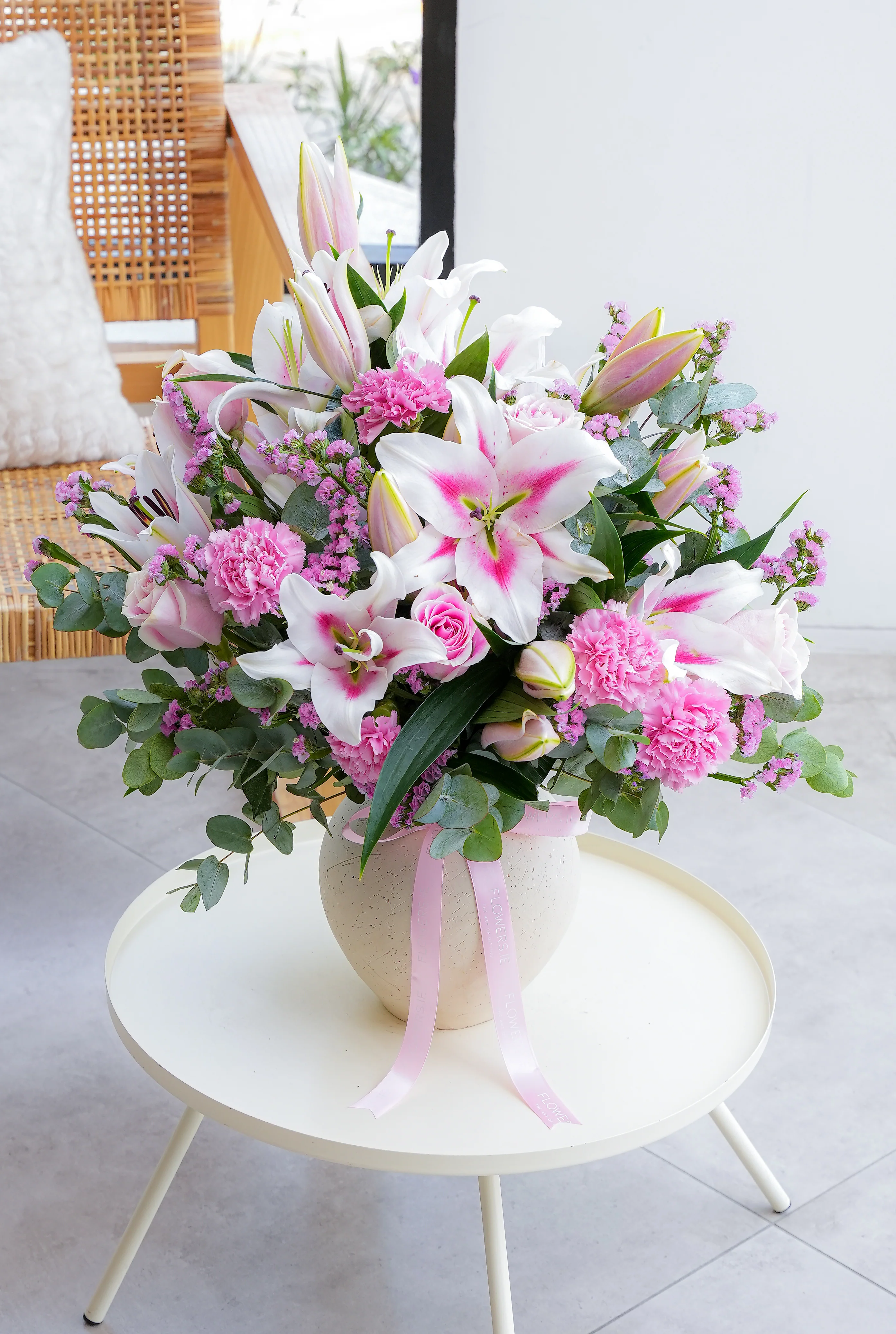 For this magnificent display, we’ve chosen fresh pink "Dalian" oriental style lilies with Carnation pink and pink seasonal fillers, all skillfully arranged in our bespoke, textured ceramic vase with lovely Irish grown eucalyptus cinerea.Â