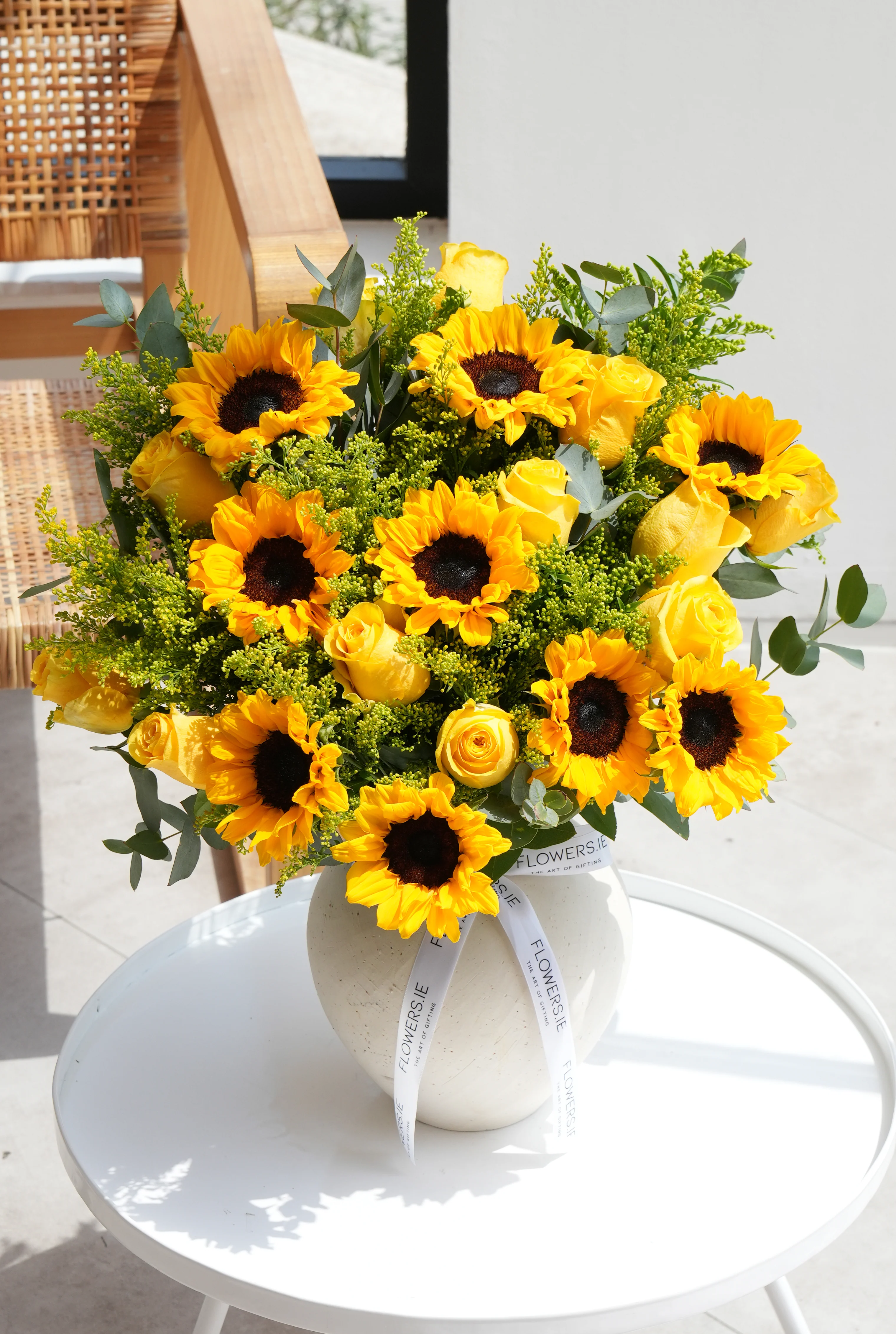 The Wonderfully Sunflower bouquet from our luxury range is bursting with summer colours. Featuring sunflowers, yellow roses, solidago, and pistacia leaves arranged in a stylish ceramic vase, this arrangement is sure to brighten up any room and bring a smile to your loved one's face.